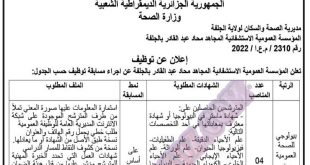 اعلان عن توظيف المؤسسة العمومية الاستشفائية المجاهد محاد عبد القادر الجلفة ads تعلن المؤسسة العمومية الاستشفائية المجاهد محاد عبد القادر الجلفة عن فتح مسابقة توظيف على اساس الشهادة في الرتب المبينة ادناه بيولوجي في الصحة العمومية من الدرجة الثانية عدد المناصب 04 نمط التوظيف …