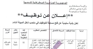 اعلان عن توظيف المجلس البلدي لبلدية بوعيشون المدية ads يعلن رئيس المجلس الشعبي البلدي لبلدية بوعيشون عن فتح توظيف على اساس الشهادات في الرتب المبينة ادناه مساعد وثائقي امين محفوظات عدد المناصب 01 نمط التوظيف مسابقة على اساس الشهادة ملف المسابقة على أساس الشهادة …