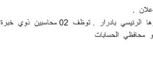 ديوان الاستشارة و الخبرة مؤسسة خاصة مقرها الرئيسي بادرار . توظف 02 محاسبين ads شرط خبرة لاتقل عن 05 سنوات و يفضل ان تكون الخبرة ممارسة في مكاتب الخبير المحاسب او محافظي الحسابات يرجى من المهتمين التواصل على البريد الالكتروني CCEYOALEB@GMAIL .COM