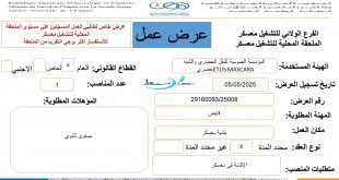 الفرع الولائي للتشغيل معسكر الملحقة المحلية للتشغيل معسكر ads عرض عمل عرض خاص لطالبي العمل المسجلين على مستوى الملحقة المحلية للتشغيل معسكر، للاستفسار أكثر يرجى التقرب من الملحقة. الهيئة المستخدمة: المؤسسة العمومية للنقل الحضري والشبه الحضري ETUS MASCARA تاريخ تسجيل العرض: 05/05/2025 رقم العرض: …