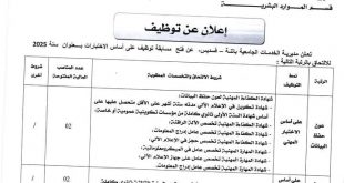وزارة التعليم العالي والبحث العلمي جامعة باتنة 1 المديرية الفرعية للمستخدمين والتكوين ads إعلان عن مسابقات توظيف تعلن إدارة جامعة باتنة -1- عن فتح توظيف خاص بالأسلاك الأعوان المتعاقدين (عقود عمل غير محددة المدة) عن طريق الاختبار المهني بعنوان سنة 2025 لشغل المناصب التالية: …