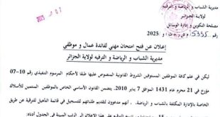 وزارة الشباب والرياضة مديرية الشباب و الرياضة و الترفيه ولاية الجزائر ads إعلان عن فتح إمتحان مهني لفائدة عمال و موظفي مديرية الشباب و الرياضة و الترفيه لولاية الجزائر ليكن في علم كافة الموظفين المستوفين الشروط القانونية المنصوص عليها طبقا لأحكام المرسوم التنفيذي رقم …