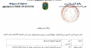 مديرية الصيد البحري وتربية المائيات ولاية الجزائر ads إعلان عن توظيف تعلن مديرية الصيد البحري و تربية المائيات لولاية الجزائر عن فتح مسابقة توظيف على أساس الشهادة للالتحاق بالرتب التالية: الرتبةعدد المناصبالشروط المطلوبة للمشاركةطبيب بيطري03من بين المترشحين الحائزين على شهادة طبيب بيطري أو شهادة …