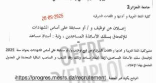 وزارة التعليم العالي و البحث العلمي جامعة الجزائر 2 كلية اللغة العربية و آدابها و اللغات الشرقية ads إعلان عن توظيف و / أو مسابقة على أساس الشهادات للإلتحاق بسلك الأساتذة المساعدين، رتبة : أستاذ مساعد تعلن كلية اللغة العربية و آدابها و اللغات …