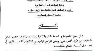 الجمهورية الجزائرية الديمقراطية الشعبية وزارة السياحة والصناعة التقليدية مديرية السياحة والصناعة التقليدية لولاية تمنراست مصلحة الإدارة والوسائل ads إعلان تعلن مديرية السياحة والصناعة التقليدية لولاية تمنراست عن توفر منصب شاغر للتوظيف عن طريق النقل فعلى الموظفين المرسمين الراغبين في الالتحاق بالمنصب المبين في الجدول …