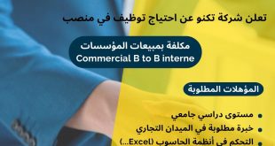 اعلان توظيف شركة تكنو ads تعلن شركة تكنو عن احتياج توظيف في منصب مكلفة بمبيعات المؤسسات. المؤهلات المطلوبة: مستوى دراسي جامعي خبرة مطلوبة في الميدان التجاري التحكم في أنظمة الحاسوب (Excel…) مستوى مقبول في اللغة الفرنسية مكان العمل: شراقة يمكنكم ارسال السيرة الذاتية عبر …