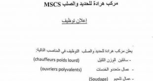 إعلان توظيف مركب هرادة للحديد والصلب ads مركب هرادة للحديد والصلب MSCS يعلن عن فتح باب التوظيف لشغل المناصب التالية: سائقين للوزن الثقيل (Chauffeurs poids lourd) عمال متعددة الخدمات (Ouvriers polyvalents) عمال تلحيم (Soudage) عمال على آلة (Opérateurs de machines) مكان العمل: المنطقة الصناعية …