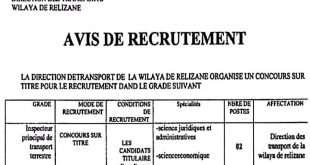 الجمهورية الجزائرية الديمقراطية الشعبية وزارة النقل مديرية النقل ولاية غليزان ads إعلان عن توظيف تعلن مديرية النقل لولاية غليزان عن تنظيم مسابقة على أساس الشهادة للتوظيف في الرتبة التالية: إعلان عن مسابقة توظيف بالمركز الوطني للبحث المطبق في هندسة مقاومة الزلازل إعلان عن مسابقة …