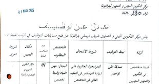 وزارة التكوين و التعليم المهنيين معهد التكوين والتعليم المهنيين سنحضري عبد الحفيظ سيدي بلعباس ads إعلان عن توظيـف يعلن معهد التكوين والتعليم المهنيين لسيدي بلعباس عن تنظيم مسابقة على أساس الاختبارات أو الشهادة للالتحاق بالأسلاك والرتب التالية: أستاذ متخصص في التكوين والتعليم المهنيين الرتبة …