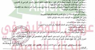 وزارة العمل والتشغيل والضمان الاجتماعي الوكالة الوطنية للتشغيل الفرع الولائي للتشغيل بالجلفة الملحقة المحلية للتشغيل بالجلفة ads عرض عمل المؤسسة المستخدمة: COSIDER CANALISATION POLE C57 القطاع القانوني: عام تاريخ العرض: 2026/03/01 عدد المناصب: 16 شروط العرض: الوضعية القانونية تجاه الخدمة الوطنية – الإقامة بالمجاورة …