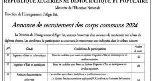 الجمهورية الجزائرية الديمقراطية الشعبية وزارة التربية الوطنية مديرية التربية لشرق الجزائر ads إعلان عن توظيف الأسلاك المشتركة 2024 تعلن مديرية التربية لشرق الجزائر عن فتح مسابقة توظيف على أساس الشهادة. شروط المشاركة في مسابقة التوظيف مبينة في الجدول التالي: الرقمالرتبةشروط المشاركةعدد المناصب01مهندس دولة في …