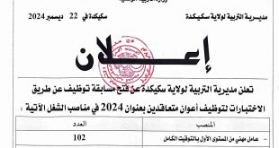 الجمهورية الجزائرية الديمقراطية الشعبية وزارة التربية الوطنية مديرية التربية لولاية سكيكدة ads سكيكدة في 22 ديسمبر 2024 إعلان تعلن مديرية التربية لولاية سكيكدة عن فتح مسابقة توظيف عن طريق الاختبارات لتوظيف أعوان متعاقدين بعنوان 2024 في مناصب الشغل الآتية: العددالمنصب102عامل مهني من المستوى الأول …