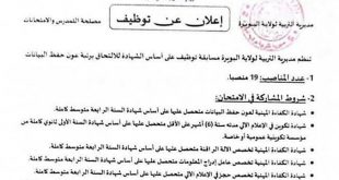 الجمهورية الجزائرية الديمقراطية الشعبية وزارة التربية الوطنية مديرية التربية لولاية البويرة مصلحة التمدرس والامتحانات ads إعلان عن توظيف تعلن مديرية التربية لولاية البويرة عن تنظيم مسابقة توظيف على أساس الشهادة للالتحاق برتبة عون حفظ البيانات. 1- عدد المناصب: 19 منصباً. 2- شروط المشاركة في …