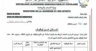 الجمهورية الجزائرية الديمقراطية الشعبية ولاية باتنة وزارة الشباب والرياضة ديوان المركب المتعدد الرياضات ads إعلان عن توظيف تعلن إدارة ديوان المركب المتعدد الرياضات لولاية باتنة عن فتح توظيف عن طريق الانتقاء بموجب عقد محدد المدة (توقيت جزئي) للالتحاق بمنصب الشغل المبين أدناه: إعلان عن …