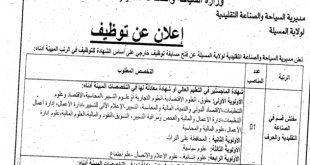 الجمهورية الجزائرية الديمقراطية الشعبية وزارة السياحة والصناعة التقليدية مديرية السياحة والصناعة التقليدية لولاية المسيلة ads إعلان عن توظيف تعلن مديرية السياحة والصناعة التقليدية لولاية المسيلة عن فتح مسابقة توظيف خارجي على أساس الشهادة للتوظيف في الرتب المبينة أدناه: إعلان عن توظيف بالمجلس الأعلى للشباب: …