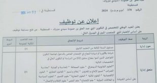 الجمهورية الجزائرية الديمقراطية الشعبية وزارة الاشغال العمومية والمئشات القاعدية مديرية الاشغال العمومية مصلحة الإدارة والوسائل ads ميلة 04/12/2024 إعلان عن مسابقة توظيف تعلن مديرية الاشغال العمومية لولاية ميلة عن فتح مسابقة توظيف لسد حاجياتها ، وذلك حسب الشروط التالية: إعلان عن توظيف بالمجلس الأعلى …