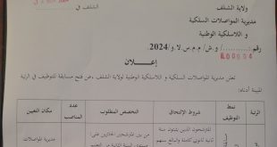 الجمهورية الجزائرية الديمقراطية الشعبية ولاية الشلف مديرية المواصلات السلكية واللاسلكية الوطنية بالشلف ads إعلان تعلن مديرية المواصلات السلكية واللاسلكية الوطنية لولاية الشلف، عن فتح مسابقة للتوظيف في الرتبة المبينة أدناه: مديرية التربية تفتح مسابقة توظيف العمال المهنيين 180 منصب سوناطراك توظف في التخصصات الطبية …