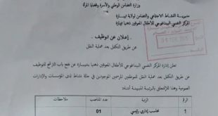 وزارة التضامن الوطني والأسرة وقضايا المرأة مديرية النشاط الاجتماعي والتضامن لولاية تيبازة المركز النفسي البيداغوجي للأطفال المعوقين ذهنيا تيبازة ads إعــــلان عـن توظيـف عن طريق التكفل بعد عملية النقل تعلن إدارة المركز النفسي البيداغوجي للأطفال المعوقين ذهنيا بتيبازة عن فتح باب التوظيف عن طريق …