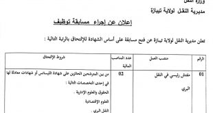 الجمهورية الجزائرية الديمقراطية الشعبية وزارة النقل مديرية النقل لولاية تيبازة ads إعلان عن إجراء مسابقة توظيف تعلن مديرية النقل لولاية تيبازة عن فتح مسابقة على أساس الشهادة للإلتحاق بالرتبة التالية: الرقمالشروط المطلوبةعدد المناصبمنصب العمل01شهادة ليسانس في الحقوق والعلوم الإدارية أو العلوم الاقتصادية أو النقل …
