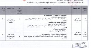 الجمهورية الجزائرية الديمقراطية الشعبية وزارة الري مديرية الري لولاية الوادي ads إعلان عن توظيف تعلن مديرية الري لولاية الوادي عن فتح مسابقة للتوظيف في الرتبة المبينة أدناه: الرتبةالنمط التوظيفالتخصصشروط الالتحاقعدد المناصبمكان التعيينالشروط الأخرىالمهلة النهائيةعون الوقاية من المستوى الأولغير محددة بالتوقيت الكاملعون الوقاية من المستوى …