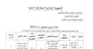 الجمهورية الجزائرية الديمقراطية الشعبية وزارة العمل والتشغيل والضمان الاجتماعي المفتشية العامة للعمل المفتشية الجهوية للعمل قسنطينة ads إعلان إشهاري للتوظيف لسنة 2024 تعلن المفتشية الجهوية للعمل لناحية قسنطينة عن فتح مسابقة للتوظيف في الرتب المبينة أدناه: مديرية التربية تفتح مسابقة توظيف العمال المهنيين 180 …