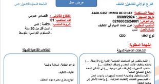 الجمهورية الجزائرية الديمقراطية الشعبية وزارة العمل والتشغيل والضمان الاجتماعي الوكالة الوطنية للتشغيل عرض عمل ads الهيئة المعنية: AADL GEST IMMO DE CHLEF تاريخ الإعلان: 09/09/2024 المنصب المطلوب: عون متعدد المهام في التنظيف عدد المناصب: 01 المدة: عقد عمل قصير المدة (CDD) الشروط: السن أقل …