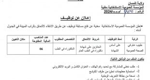 الجمهورية الجزائر الديمقراطية الشعبية وزارة الصحة مديرية الصحة والسكان لولاية سيدي بلعباس المؤسسة العمومية الاستشفائية لسيدي بلعباس إعلان عن توظيف ads تنظم المؤسسة العمومية الاستشفائية الشهيد “داحماني سليمان” بسيدي بلعباس مسابقة توظيف برسم سنة 2024 للولوج إلى الرتب التالية: الرتبةطريقة التوظيفشروط الولوجالتخصصات المطلوبةعدد المناصبمكان …
