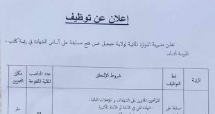 الجمهورية الجزائرية الديمقراطية الشعبية مديرية الموارد المائية لولاية جيجل ads إعلان عن توظيف تعلن مديرية الموارد المائية لولاية جيجل عن فتح مسابقة على أساس الشهادة في رتبة كاتب، وذلك حسب الشروط المبينة أدناه. الرتبةالشروط المطلوبةمكان التعيينعدد المناصب المالية المفتوحةكاتبشهادة تقني في الأمانة أو الأمانة …