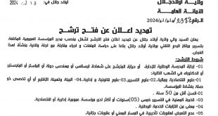الجمهورية الجزائرية الديمقراطية الشعبية ولاية أولاد جلال تمديد إعلان عن فتح ترشح ads يعلن السيد والي ولاية أولاد جلال عن تمديد إعلان فتح الترشح لشغل منصب مدير المؤسسة العمومية المكلفة بتسيير مراكز الردم التقني بولاية أولاد جلال بناءً على دراسة الملفات وإجراء مقابلة مع …