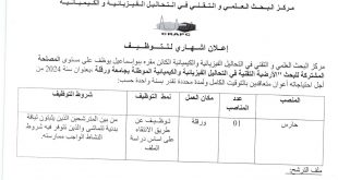 الجمهورية الجزائرية الديمقراطية الشعبية مركز البحث العلمي والتقني في التحاليل الفيزيائية والكيميائية إعلان اشهاري للتوظيف ads مركز البحث العلمي والتقني في التحاليل الفيزيائية والكيميائية الكائن مقره ببوإسماعيل يوظف على مستوى المصلحةالمشتركة للبحث “الأرضية التقنية في التحاليل الفيزيائية والكيميائية الموطنة بجامعة ورقلة ، بعنوان سنة …