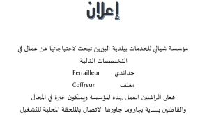 وزارة العمل والتشغيل والضمان الاجتماعي الوكالة الوطنية للتشغيل المحلقة المحلية للتشغيل بالبيرين ads إعلان مؤسسة كوسيدار ببلدية بهار تبحث عن عمال في التخصصات التالية: سائق شاحنة رفع الآلات Conducteur porte engins سائق مضخة خرسانية Conducteur pompe a béton فعلى الراغبين العمل بهذه المؤسسة ويملكون …