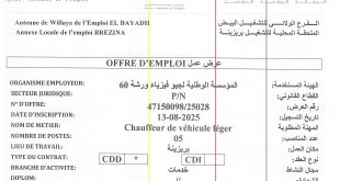 وزارة العمل والتشغيل والضمان الاجتماعي الوكالة الوطنية للتشغيل الملحقة المحلية للتشغيل بريزينة الملحقة المحلية للتشغيل بريزينة ads عرض عمل OFFRE D’EMPLOI الهيئة المستخدمة: المؤسسة الوطنية للجيوفيزياء ورشة 60 القطاع القانوني: خاص وطني تاريخ التسجيل: 13-08-2025 المهنة المطلوبة: Chauffeur de véhicule léger عدد المناصب: 05 …