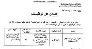 وزارة التكوين و التعليم المهنيين مركز التكوين المهني و التمهين زدور محمد ابراهيم القاسم ads إعلان عن توظيف يعلن مركز التكوين المهني و التمهين “زدور محمد ابراهيم القاسم” بزدانة ولاية معسكر، عن فتح توظيف عن طريق الإختبار المهني في المنصب أدناه: منصبشروط التوظيفشروط الالتحاقعدد …