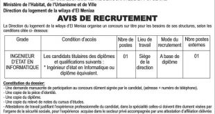 اعلان عن توظيف مديرية التجهيزات العمومية لولاية المنيعة ads تعلن مديرية التجهيزات العمومية لولاية المنيعة عن فتح مسابقة توظيف في الرتب المبينة ادناه مهندس دولة في الاعلام الالي عدد المناصب 01 منصب نمط التوظيف: مسابقة على اساس الشهادة ملف المسابقة على أساس الشهادة طلب …