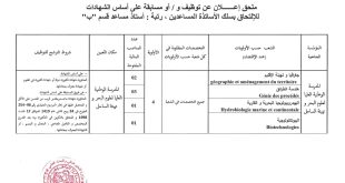 اعلان توظيف المدرسة الوطنية العليا لعلوم البحر وتهيئة الساحل ads تعلن المدرسة الوطنية العليا لعلوم البحر وتهيئة الساحل عن توظيف على اساس الشهاداة للالتحاق بسلك الاساتذة المساعدين في رتبة: استاذ مساعد قسم ب تقبل الملفات التي تم ايداعها من طرف المترشحين خلال الفترة الممتدة …