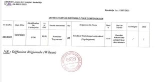نظرا لاحتياجاتها اليد العاملة تعلن شركة تيرصام الكائن مقرها بالمنطقة الصناعية كشيدة باتنة عن توظيف في المناصب التالية ads 01 مسؤول الانتاج في الصناعة الميكانيكية 02 مهندس لمتابعة الانتاج في الصناعة الميكانيكية 02 مهندس مراقبة الجودة 10 ميكانيكي 04 كهربائي سيارات 04 دهان سيارات …