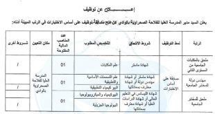اعلان عن توظيف المدرسة العليا للفلاحة الصحراوية بالوادي ads تعلن المدرسة العليا للفلاحة الصحراوية بالوادي عن فتح مسابقة توظيف على اساس الاختبارات في المناصب المدرجة ادناه ملحق بالمكتبات الجامعية من المستوى الثاني عدد المناصب 01 منصب مسابقة على اساس الاختبارات مهندس دوللة للمخابر الجامعية …
