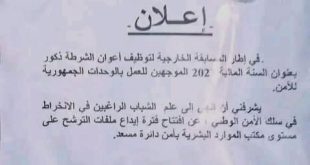 تعلن المديرية العامة للامن الوطني بتمنراست عن فتح مسابقة توظيف الخارجية على أساس الاختبارات لتوظبف أعوان الشرطة ابتداء من تاريخ 21/05/2023 حيث يخضعون المترشحون للشروط القانونية المحددة لمرسوم الرئاسي المتضمن القانون الأسسي خاص بالموظفين المنتيمن للأسلاك الخاصة بلأمن الوطني بصفة عون شرطة : ads …