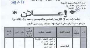 اعلان عن توظيف مركز التكوين المهني والتمهين محمد بلال القنطرة ads يعلن مركز التكوين المهني والتمهين محمد بلال القنطرة عن مسابقة توظيف على اساس الشهادة وعلى الاختبار المهني في المناصب المدرجة ادناه ادناه ملحق ادارة عدد المناصب 01 منصب مسابقة على اساس الشهادة مساعد …