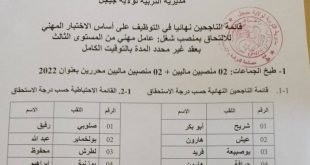 مديرية التربية ولاية جيجل ads قائمة الناجحين نهائيا في التوظيف على اساس الاختبار المهني للالتحاق بمنصب الشغل عامل مهني من المستوى الاول بعقد غير محدد المدة بالتوقيت الكامل قائمة الناجحين نهائيا في التوظيف على اساس الاختبار المهني للالتحاق بمنصب الشغل عامل مهني من المستوى …