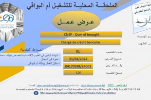الفرع الولائي للتشغيل قالمة الملحقة المحلية للتشغيل قالمة عرض عمل بنك التوفير والاحتياط CNEP BANQUE ads الفرع الولائي للتشغيل ام البواقي الملحقة المحلية للتشغيل ام البواقي عرض عمل بنك التوفير والاحتياط CNEP BANQUE الفرع الولائي للتشغيل عنابة الملحقة المحلية للتشغيل عنابة 1 عرض عمل …