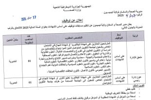 وزارة الصحة والسكان واصلاح المستشفيات المديرية العامة للموارد البشرية ads اعلان عن توظيف يعلن مدير الصحة والسكان واصلاح المستشفيات تيميمون عن تنظيم مسابقة على اساس الشهادات بصفة سنوية لسنة 2025 للالتحاق بالرتب المبينة بالجدول التالي: الرتبة: ملحق إدارة للإدارة، عون إدارة رئيسي نمط التوظيف: …