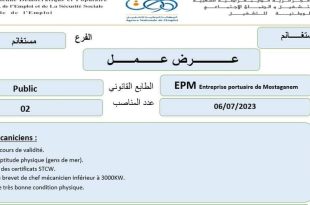 الفرع الولائي للتشغيل مستغانم الملحقة المحلية للتشغيل مستغانم عرض عمل EPM – Entreprise portuaire de Mostaganem ads تعلن الملحقة المحلية للتشغيل مستغانم عن عرض عمل بEPM – Entreprise portuaire de Mostaganem كما هو موضح ادناه الهيئة المستخدمة EPM – Entreprise portuaire de Mostaganem المنصب …