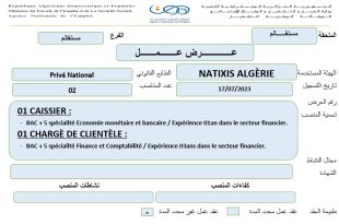 الفرع الولائي للتشغيل مستغانم الملحقة المحلية للتشغيل مستغانم عرض عمل بنك NATIXIS ALGERIE ads تعلن الملحقة المحلية للتشغيل مستغانم عرض عمل ببنك NATIXIS ALGERIE هو موضح ادناه الهيئة المستخدمة بنك NATIXIS ALGERIE المنصب المطلوب caissier 01 charge de clientele 01 مكان العمل : مستغانم …