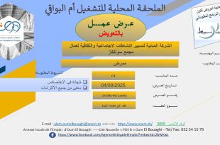 الملحقة المحلية للتشغيل ام البواقي ads عرض عمل اسم المؤسسة: الشركة المدنية لتسيير النشاطات الاجتماعية والثقافية لعمال مجمع سونلغاز المنصب المطلوب: طبيب عام ممرض الشروط المطلوبة: شهادة في الاختصاص خبرة مستحقة معفى من جميع الالتزامات تاريخ العرض: 04/09/2025 نوع العقد: عقد غير محدد المدة …