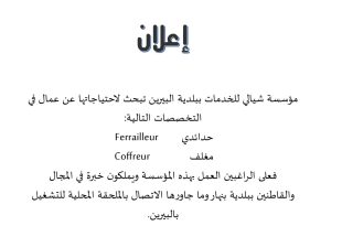 وزارة العمل والتشغيل والضمان الاجتماعي الوكالة الوطنية للتشغيل المحلقة المحلية للتشغيل بالبيرين ads إعلان مؤسسة كوسيدار ببلدية بهار تبحث عن عمال في التخصصات التالية: سائق شاحنة رفع الآلات Conducteur porte engins سائق مضخة خرسانية Conducteur pompe a béton فعلى الراغبين العمل بهذه المؤسسة ويملكون …
