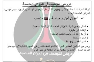 اعلان توظيف شركة الحراسة الحماية والامن CGPS ads توظيف أعوان أمن و حراسة : 40 منصب كل التفاصيل في الصورتين المرفقين الملف موضح بالتفصيل في الصورة الثانية العمل يكون في المناطق التالية : سيدي يحيى، حيدرة، بئر مراد رايس، سعيد حمدين، الأبيار، بن عكنون …