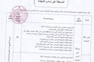 اعلان توظيف المؤسسة العمومية الاستشفائية المسيلة ads تعلن المؤسسة العمومية الاستشفائية المسيلة عن فتح مسابقة توظيف على اساس الشهادة في الرتب المبينة ادناه عون ادارة عدد المناصب 02 منصب نمط التوظيف على اساس الشهادة ملف المسابقة على أساس الشهادة طلب خطي يتم تضمين به …