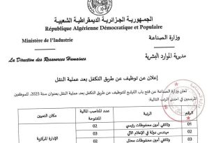 وزارة الصناعة مديرية الموارد البشرية ads إعلان عن توظيف عن طريق التكفل بعد عملية النقل تعلن وزارة الصناعة عن فتح باب الترشح للتوظيف عن طريق التكفل بعد عملية النقل بعنوان سنة 2025، للموظفين المرسمين في إحدى الرتب التالية: الرقمالرتبةعدد المناصب المالية المفتوحةمكان التعيين01وثائقي أمين …