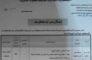 وزارة المجاهدين وذوي الحقوق مديرية المجاهدين وذوي الحقوق ولاية قسنطينة ads إعلان عن توظيف تعلن مديرية المجاهدين وذوي الحقوق لولاية قسنطينة عن فتح مسابقة على أساس الشهادات للتوظيف في الرتب المبينة أدناه: الرتبةعدد المناصب المالية المفتوحةنمط التوظيفنمط التوظيفشروط أخرى عون إدارة رئيسي01مسابقة على أساس …